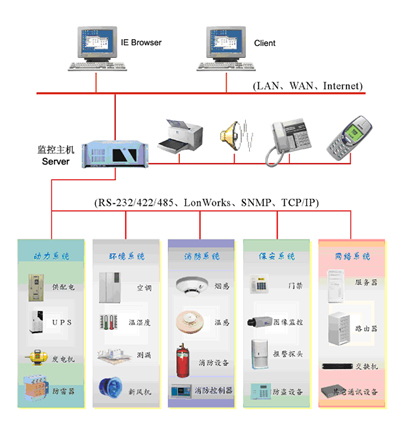 [方案概述:] 随着计算机技术的发展和普及,计算机系统数量与日俱增,其配套的环境设备也日益增多,机房管理就显得更为重要,为此,我们推出了易控机房动力环境监控平台,为机房的数据应用系统护航。 [方案架构:] 各智能设备提供智能接口及通讯协议,采用总线的方式将设备的监控信号接入监控服务器的串口,由监控平台软件对该设备进行实时监测。 非智能设备采用隔离数字量输入模块采集设备提供的干接点信号后,再通过隔离数字量输入模块的智能接口及通讯协议采用总线的方式将信号接入监控服务器的串口,由监控平台软件对该设备进行实时监测。 [方案特点:] 1、高可靠性:采用成熟的软硬件产品,运行稳定; 2、系统集成度高:系统完美整合了每个子系统、无外挂其他软件; 3、系统扩展性能强:模块化结构有利于扩容与扩展; 4、实时性高:做到 1 秒内完成本地数据采集,3 秒内完成本地到区域和集中监控中心的所有命令响应、执行。 5、开放性好:可通过网络接入大机房监管系统及联网监控系统;也可通过SOCKET 等标准数据接口,将数据传送给其他系统。 6、整合网络设备监管:可实现对网络链路、网络设备、服务器、操作系统、数据库、业务系统等内容的监管。 [监控系统:]